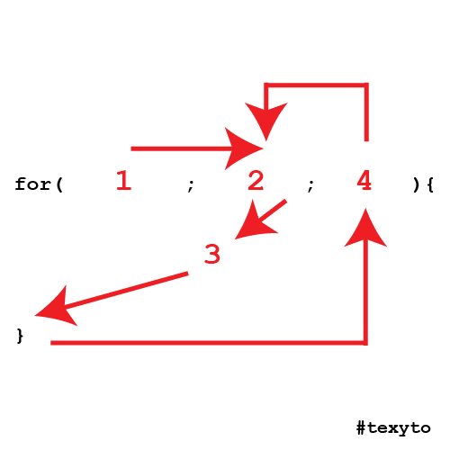 දැන් අපි බලමු මේ loop එක run වෙන විදිය. මුලින්ම අපි 1 ලෙස සටහන් කර ඇති ස්ථානයට loop එක පටන්ගන්න ඕන value එක දුන්නා. අන්න ඒ කොටස තමයි loop එකේ මුලින්ම run වෙන්නෙ. ඒට පස්සෙ run වෙන්නෙ 2ක කොටස. එකෙදි අපි මුලින් loop එක පටන් ගන්න දීපු අගය condition එකත් එක්ක check කරල බලනවා ඊට පස්සෙ condition එක true වෙනවනම් ඊලගට for loop එකේ body(3) එක, එහෙම නැත්තම් අපි loop කරන්න කියල තියෙන code ටික run වෙනවා. එහෙම run කරල curly brace එක ඉවර වෙන තැනට ගියහම, එහෙම නැත්තම් එක පාරක් loop වුනාට පස්සෙ ඊලගට 4 කියල අපි සටහන් කර ස්ථානයට යනවා. එතන අපි loop එක එක පාරක් run උනට පස්සෙ වෙන්න ඕන දේ ලියලා තියෙනවා. මෙයා ඒ දේ කරල ආපහු condition ඒක check කරල බලනවා. ඒක true වෙනවනම් ආපහු ඒකේ body(3) එක run කරනව false වෙනවනම් loop එකෙන් ඉවත් වෙනවා.